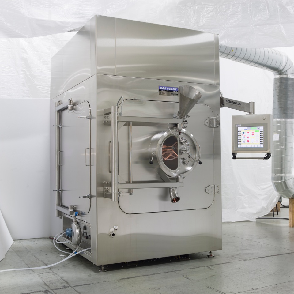 Our Fastcoat™ Interchangeable tablet coating systems are designed to supply a quick and reliable solution to your production requirements. Supplied with a remote air handling unit with dehumidification and HEPA filtration as standard. Additional features such as pre-heat and humidification are also available to provide an optimal coating environment, year-round. Anti-bearding spray nozzles are supplied on our O’Hara Professional Coating Arm (PCA), which is a block-style manifold with built-in tubing for liquid and compressed air to allow for a sleek and organized appearance. Upon completion of each batch, tablets are unloaded automatically with our reverse unloading system.